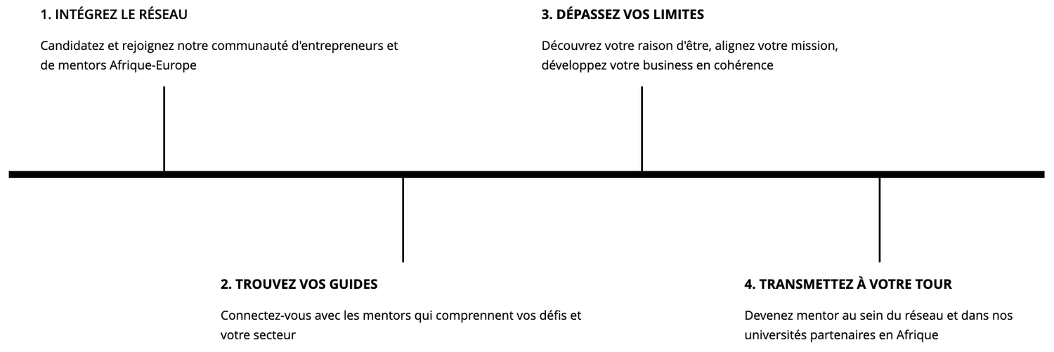 C'est pour ça que nous développons un réseau intercontinental d'entrepreneurs et de mentors européens et africains, où les expériences se croisent, les cultures se complètent et les entreprises se renforcent mutuellement. Ce réseau vous permet de découvrir votre raison d'être, d'aligner votre mission, de trouver vos guides et de développer un business solide et durable.